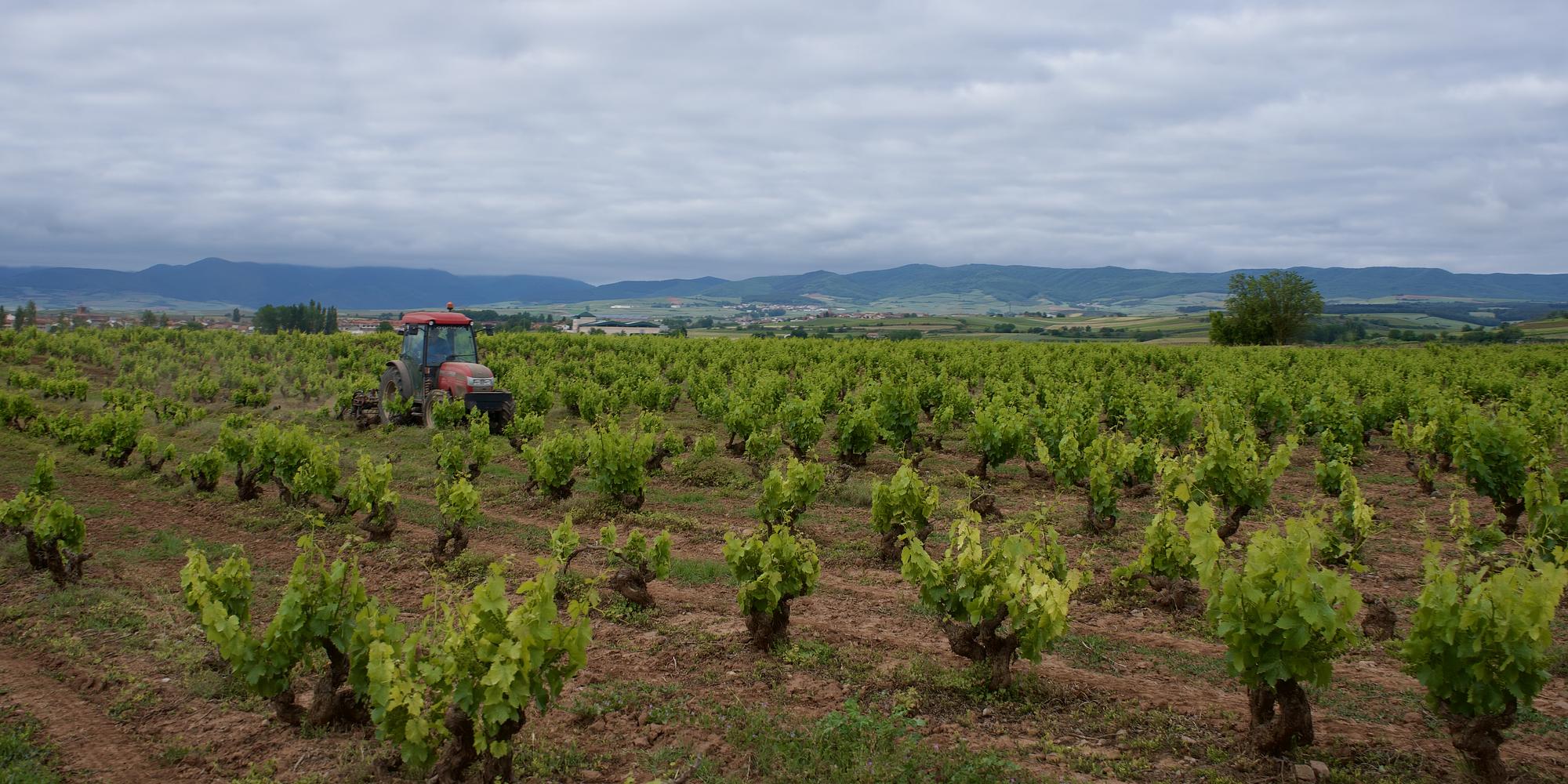 Farmer in his tractor going through his vineyard along the Camino Frances